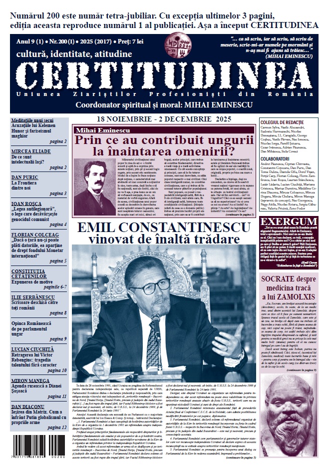 DIN SUMAR ● MIHAI EMINESCU. Prin ce au contribuit ungurii la înaintarea omenirii? ● MIRON MANEGA. Emil Constantinescu, vinovat de înaltă trădare ● MIRON MANEGA. Socrate despre medicina tracă a lui Zamolxis ● NAGY ATTILA. Meditaţiile unui secui. Acuzaţiile lui Kelemen Hunor şi fariseismul maghiar ● MIRCEA ELIADE. De ce sunt intelectualii lași? ●…