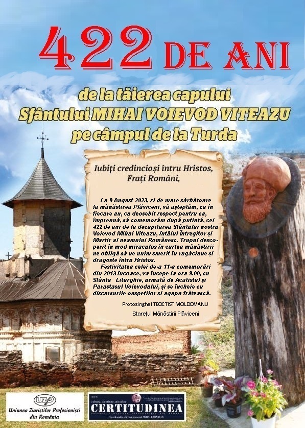 De aceea, la 9 August 2023, zi de mare sărbătoare la mănăstirea Plăviceni, vă așteptăm, ca în fiecare an, cu deosebit respect pentru ca, împreună, să comemorăm, după putință, cei 422 de ani de la decapitarea Sfântului nostru Voievod Mihai Viteazu, Întâiul Întregitor și Martir al Neamului Românesc. Trupul descoperit în mod miraculos în curtea mănăstirii ne obligă să ne unim smerit în rugăciune și dragoste întru Hristos. Festivitatea celei de-a 11-a comemorări din 2013 încoace, va începe la ora 9.00, cu Sfânta Liturghie, urmată de Acatistul și Parastasul Voievodului, și se încheie cu discursurile oaspeților și agapa frățească.