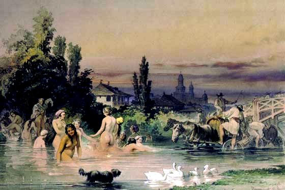 Ceva-ceva din exuberanța acelor vremuri a surprins și Preziosi, în desenele sale, din care nu lipsesc primele… îmbăieri, de mai, în apa Dâmboviței sau a Colentinei!