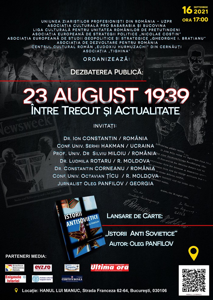 Astăzi 16 septembrie, începând cu ora 17.00, la HANUL LUI MANUC, Strada Franceza nr. 62-64, București, va avea loc dezbaterea publică „23 august 1939, între trecut și actualitate”. Cu această ocazie va avea loc și lansarea cărții „Istorii Antisovietice”, de Oleg PANFILOV (Georgia). Fiind o dezbatere deschisă, sunt invitați să participle profesori, studenți, ziariști, oameni de cultura, toți cei interesați de istoria, prezentul și viitorul nostru.