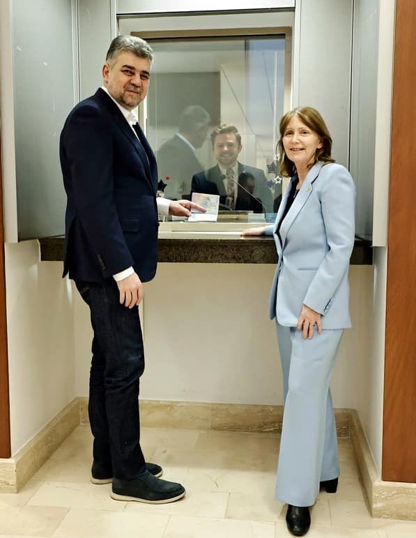 Marcel Ciolacu la ghișeu, alături de ambasadoarea Kathleen Kavalec